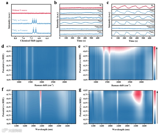 图4.a)NO3-RR后的1H核磁共振光谱在-0.5 V与RHE(使用15NO3-和14NO3-作为原料),b)T和c)TCP在15NO3-RR的DEMS测试,d)T和e)在不同电位的NO3-RR测试中的原位拉曼,原位ATR-IR光谱f)没有NO3-和g)与NO3-在TCP的电解质中。
