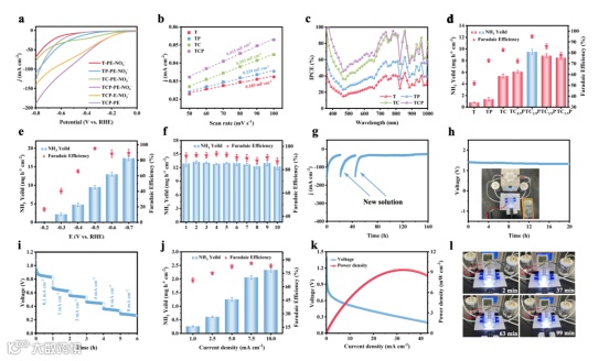 图3.a)有或无NO3-的不同样品的LSV曲线,b)电容电流作为扫描率的函数,c)-0.5 V与RHE不同催化剂的IPCE,d)-0.5 V与RHE下不同样品的NH3产量和FE,e)TCP的NH3产量和FE(从-0.2到-0.7 V与RHE),f)TCP在-0.6 V与RHE的TCP循环测试,g)TCP在-0.5 V与RHE的长期稳定性,h)Zn-NO3电池与TCP的开路电压,i)不同电流密度下的Zn-NO3电池的放电曲线,j)Zn-NO3电池在不同电流密度下的NH3产量,k)放电极化曲线和Zn-NO3电池与TCP产生的功率密度,l)Zn-NO3电池为电子计时器供电100分钟的照片。
