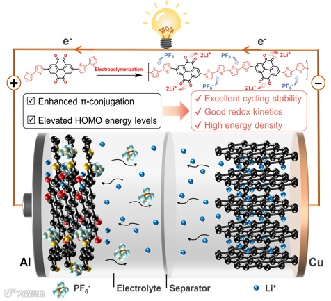 有机双离子电池正极材料因其可持续性和结构多样性成为高能量密度储能系统的理想候选,但传统有机材料面临容量快速衰减、循环稳定性差及溶解性等瓶颈问题。双极型材料虽能协同利用n型(阳离子存储)的高容量与p型(阴离子存储)的高电压特性,但常因引入非活性结构单元导致容量受限,且分子溶解性严重影响循环寿命。现有策略如电聚合虽能提升稳定性,但噻吩基共轭聚合物的最高占据分子轨道(HOMO)能级调控及其对阴离子存储的促进作用尚未明确。针对这一挑战,本研究通过分子工程策略设计噻吩桥联的芘四酮衍生物,调控HOMO能级并扩展π共轭体系,以同步提升电聚合效率与氧化还原活性,为开发兼具高容量、高电压及长循环性能的有机正极材料提供新思路。
