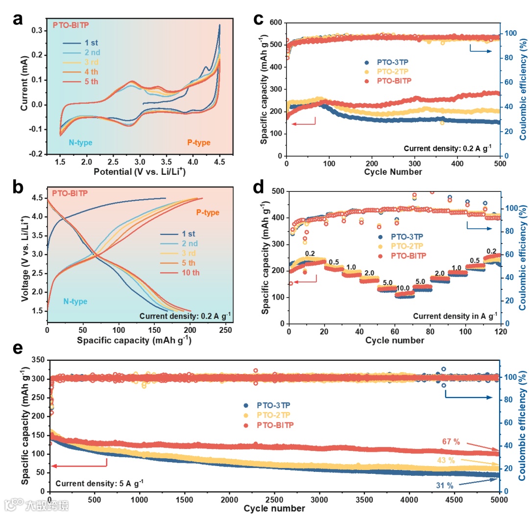 图1. PTO-3TP、PTO-2TP和PTO-BITP作为正极的锂离子电池电化学性能。(a)0.2 mV s-1扫描速率下的循环伏安曲线;(b)PTO-BITP正极在200 mA g-1电流密度下的恒流充放电曲线。(c)PTO-3TP、PTO-2TP和PTO-BITP正极在不同电流密度下的倍率性能。(d)PTO-3TP、PTO-2TP和PTO-BITP正极在1.5-4.5 V电压范围内、200 mA g-1电流密度下的循环性能。(e)PTO-3TP、PTO-2TP和PTO-BITP正极在5 A g-1电流密度下的长期循环性能。