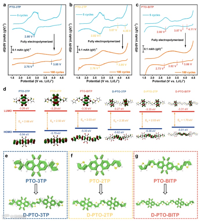 图2. (a)PTO-3TP、(b)PTO-2TP和(c)PTO-BITP正极材料在不同循环周期下的dQ/dV曲线。(d)PTO-3TP、PTO-2TP、PTO-BITP、D-PTO-3TP、D-PTO-2TP和D-PTO-BITP的HOMO与LUMO能级计算结果及分子轨道分布图;Eg表示HOMO-LUMO能隙。(e)PTO-3TP与D-PTO-3TP、(f)PTO-2TP与D-PTO-2TP、(g)PTO-BITP与D-PTO-BITP的定域化轨道定位πLOL-π等值面图。