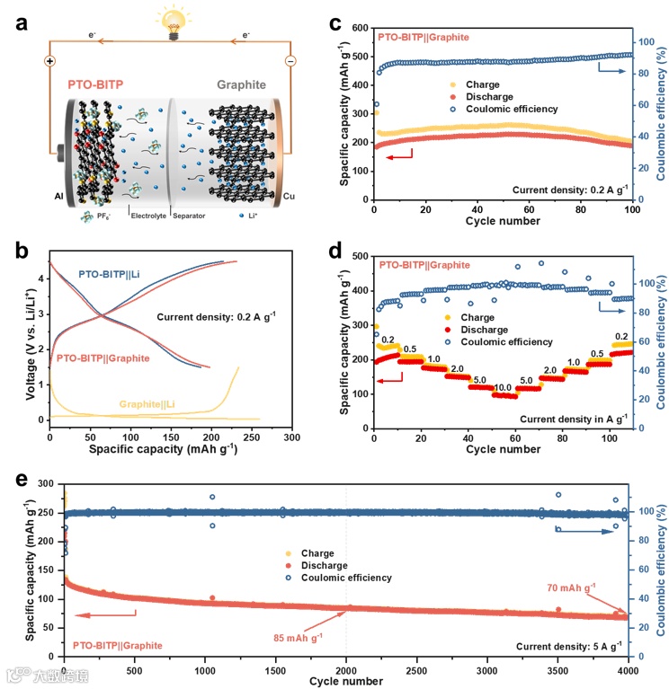 图3. 由PTO-BITP正极与石墨负极组成的全电池电化学性能。(a)PTO-BITP||石墨全电池结构示意图。(b)PTO-BITP||石墨全电池、PTO-BITP||锂半电池及石墨||锂半电池的充放电曲线。(c)0.2 A g-1电流密度下的循环稳定性,(d)倍率性能及(e)5 A g-1电流密度下PTO-BITP||石墨全电池的循环性能。