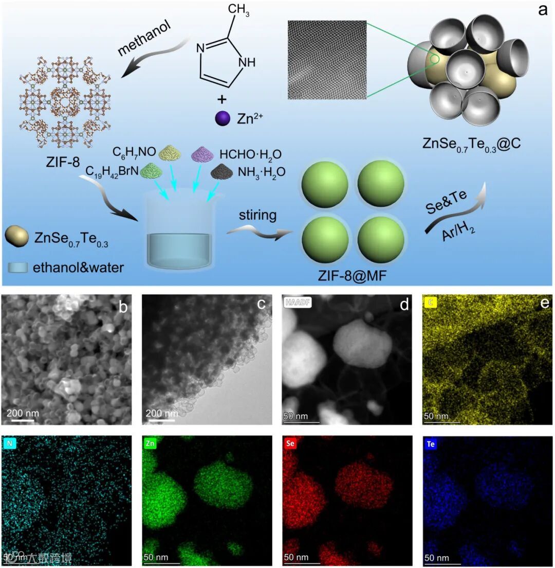 图1. ZnSe0.7Te0.3@C的形貌和结构表征。a, ZnSe0.7Te0.3@C的制备过程示意图。b, ZnSe0.7Te0.3@C的FESEM图像,以及c, ZnSe0.7Te0.3@C的TEM图像。d 和e, ZnSe0.7Te0.3@C的STEM–EDX元素映射图:C(黄色)、N(天蓝色)、Te(蓝色)、Se(红色)和Zn(绿色)。