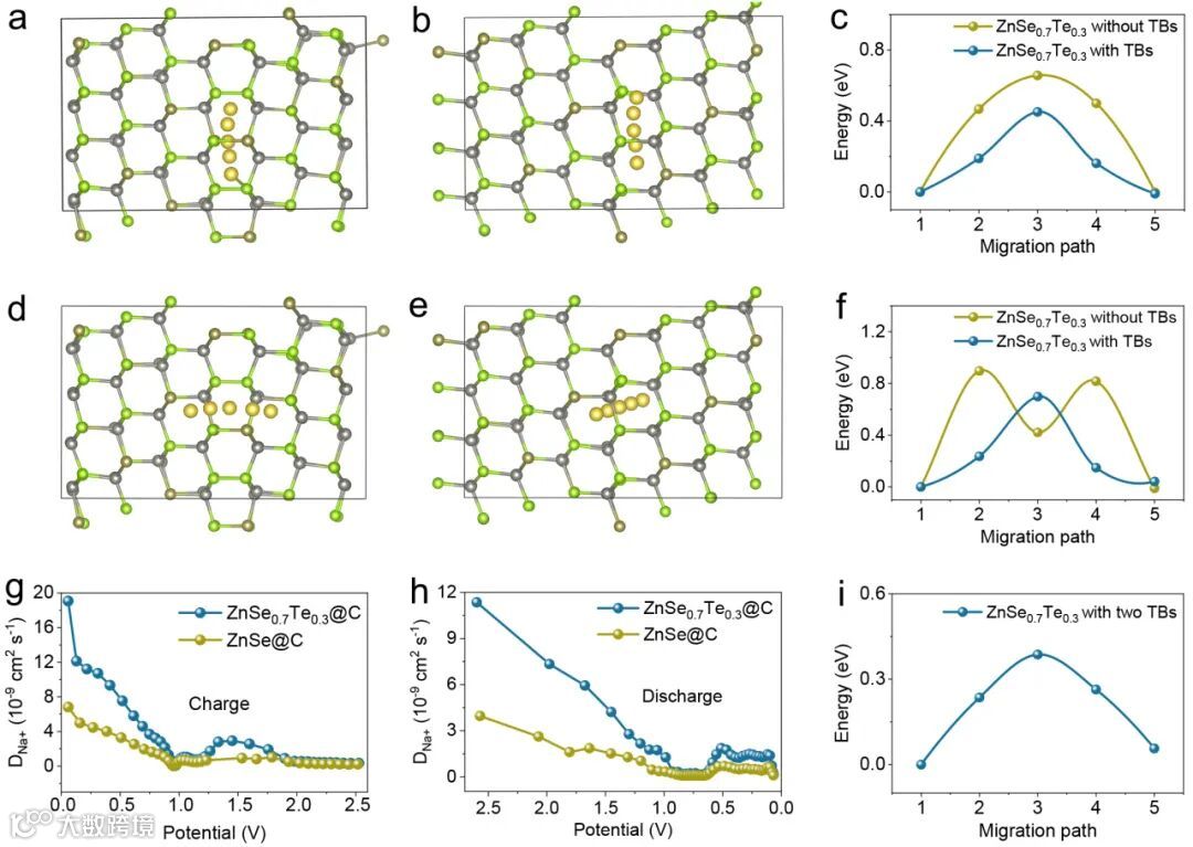 图4. 钠离子在有/无TBs的ZnSe0.7Te0.3中的扩散机制。钠离子在ZnSe0.7Te0.3中的扩散模型:a, 存在TBs时沿TB的扩散路径(Se:绿色,Zn:灰色,Te:深黄色,Na:黄色);b, 不存在TBs时的扩散路径。c, 存在/不存在TBs时钠离子沿TB扩散的能垒;d, 存在TBs时钠离子跨TB的扩散模型;e, 不存在TBs时钠离子跨TB的扩散模型。f, 存在/不存在TBs时钠离子跨TB扩散的能垒。充电过程 (g) 和放电过程 (h)中钠离子的扩散速率通过GITT计算得出。i, 存在两个TBs时ZnSe0.7Te0.3中钠离子跨TB扩散的能垒。测试温度:25(±0.5)°C(空气对流环境)。