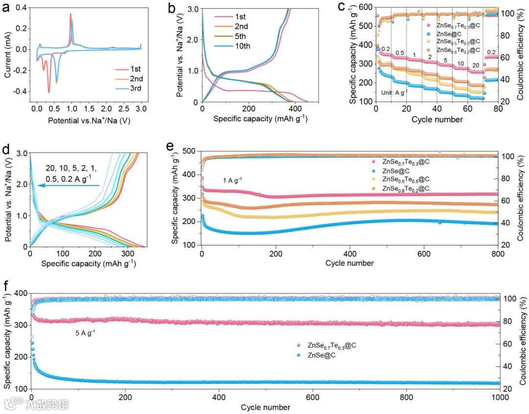 图5. ZnSe@C、ZnSe0.5Te0.5@C、ZnSe0.8Te0.2@C和ZnSe0.7Te0.3@C纳米复合材料的电化学表征。a, ZnSe0.7Te0.3@C的CV曲线;b, ZnSe0.7Te0.3@C在电流密度为0.2 A g⁻¹时的恒电流充放电曲线。c, ZnSe@C、ZnSe0.5Te0.5@C、ZnSe0.8Te0.2@C和ZnSe0.7Te0.3@C的倍率性能;d, ZnSe0.7Te0.3@C在不同电流密度下的充放电曲线。e, 在电流密度为1 A g⁻¹(1 A g⁻¹=1.6 C)时的长期循环性能。f, ZnSe@C和ZnSe0.7Te0.3@C在电流密度为5 A g⁻¹时的长循环性能。测试温度:在空气对流环境下为25(±0.5)°C。