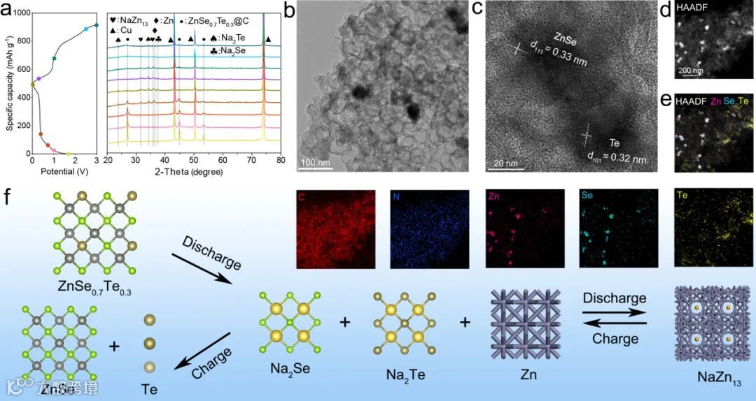 图6. 钠离子与ZnSe0.7Te0.3@C纳米复合材料的电化学反应表征。a, ZnSe0.7Te0.3@C在首次充放电过程中的非原位XRD图谱。b, ZnSe0.7Te0.3@C经过两次完整充放电循环后的TEM图像,c, HRTEM图像,d, HAADF–STEM图像,以及e 元素映射图像。f, ZnSe0.7Te0.3在首次充放电过程中钠离子反应机理的示意图。测试温度:在空气对流环境下为25(±0.5)°C。