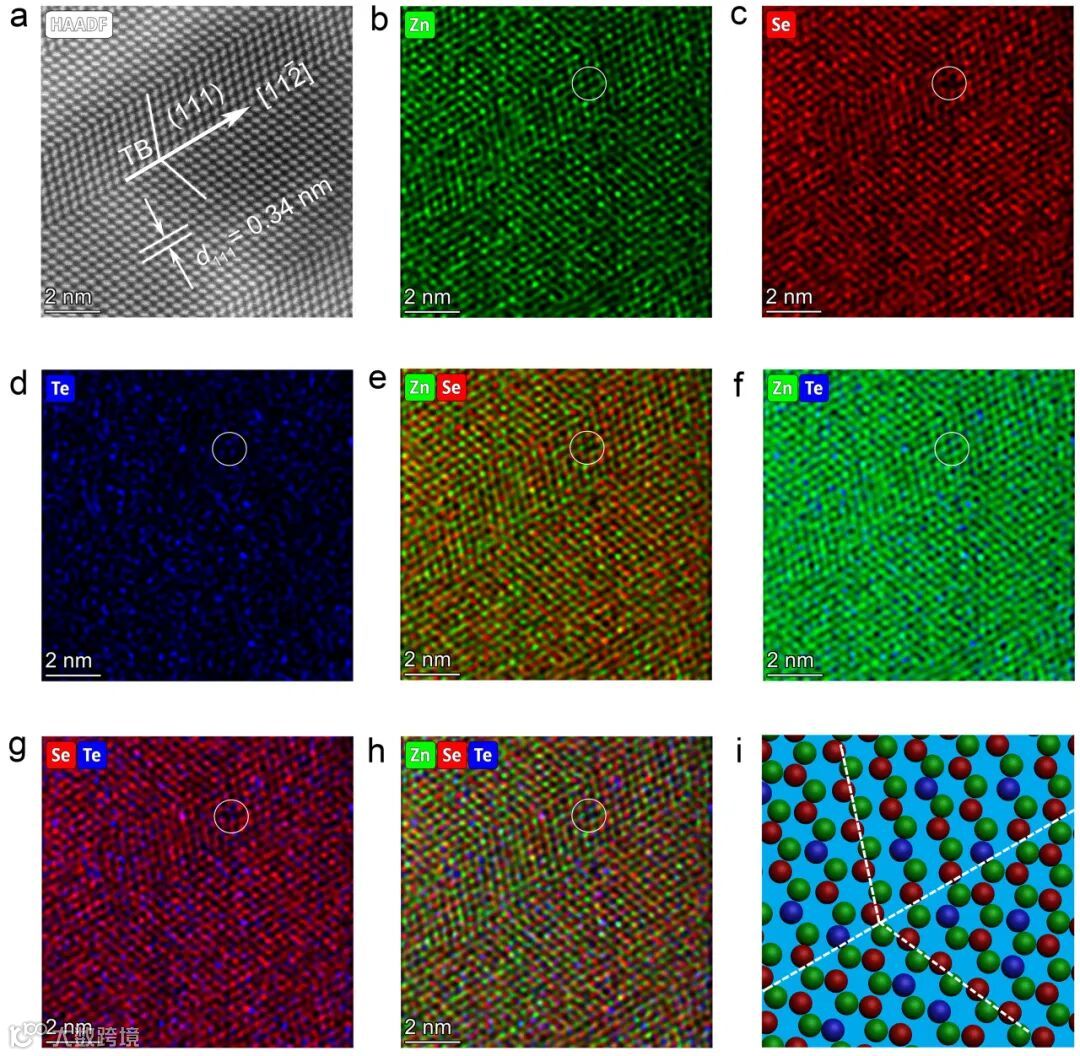 图2. ZnSe0.7Te0.3@C中孪晶界的表征。a-h, 原子级分辨的HAADF–STEM图像(a),以及相应的EDX图谱,包括b, Zn、c, Se、d, Te、e, Zn和Se的合并图像、f, Zn和Te的合并图像、g, Se和Te的合并图像,以及h, Zn、Se和Te的合并图像。I, 孪晶结构的ZnSe0.7Te0.3的原子模型示意图(Zn:绿色,Se:红色,Te:蓝色)。