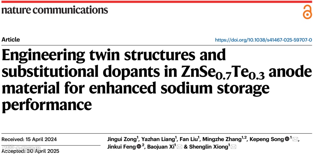 近日,山东大学熊胜林(国家“万人计划”科技领军人才)、奚宝娟&宋克鹏等人在国际知名期刊Nature Communications上发表题为“Engineering twin structures and substitutional dopants in ZnSe0.7Te0.3 anode material for enhanced sodium storage performance”的研究论文。该研究论文通过引入零维Te杂原子,从而在ZnSe0.7Te0.3纳米晶体中引入二维孪晶面缺陷。通过球差电镜观察发现Te掺杂物位于ZnSe晶格中。理论计算结果表明,Te掺杂原子部分取代ZnSe中的Se原子从热力学上促进了孪晶结构的形成。随着孪晶界(TBs)的增加,钠离子扩散能垒大大降低,有利于钠离子扩散动力学。此外,还通过调整掺杂水平来优化材料的成分和TBs的数量,点缺陷和孪晶结构的共同作用大大提高了ZnSe0.7Te0.3@C的储钠性能。
