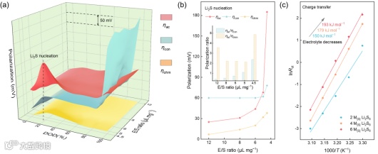 使用EIS‒GITT方法定量解耦了不同电解液用量下,弱溶剂化锂硫电池的电化学极化(ηac),浓差极化(ηcon)和欧姆极化(ηohm)的演变规律。随着E/S ratio下降,三种极化都在Li2S形核阶段达到最大值或局部最大值,表明Li2S形核阶段是弱溶剂化锂硫电池在低电解液条件下正极反应动力学的最迟滞阶段。进一步分析三种动力学极化在Li2S形核阶段随E/S ratio下降的演变规律,当电解液用量下降到E/S ratio = 4.5 μL mg−1时,电化学极化增加到185 mV,占比达到61%,是主要极化来源。随后,采用电化学极化与浓差极化(ηac/ηcon)以及电化学极化与欧姆极化(ηac/ηohm)之比说明电化学极化的相对增长速率。ηac/ηcon在电解液用量为6 μL mg−1的条件下为0.7, 当电解液用量下降到4.5 μL mg−1时,比值迅速上升至2.4。当电解液用量从6下降至4.5 μL mg−1,ηac/ηohm从2.2增加至4.9,表明电化学极化是低电解液条件下弱溶剂化锂硫电池反应动力学的关键限制因素。