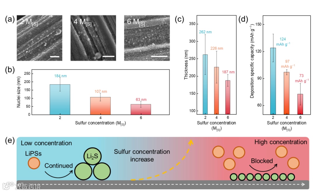 为了确认低电解液条件下硫氧化还原动力学与正极活性物质转化率的关系,本文研究了Li2S在不同浓度下的形核和沉积行为。采用扫描电镜(SEM)观测了硫化锂在不同浓度下的形核形貌。发现随着硫浓度提升,Li2S形核形貌从扩散控制的三维半球状形貌,逐渐转变为界面反应控制的二维针状形貌。并且Li2S形核尺寸随着浓度增加而下降。随后,对Li2S的最终沉积厚度和沉积容量进行了定量测量,发现在2 M[S] 条件下,Li2S沉积层厚度为262 nm,沉积容量为 124 mAh g−1,随着浓度增加至6 M[S],Li2S沉积层厚度下降至187 nm,沉积容量下降至73 mAh g−1。表明低电解液条件下,迟滞的界面反应动力学降低了多硫化锂的沉积维度,导致导电表面快速被覆盖,Li2S沉积提前终止,弱溶剂化锂硫电池比容量衰减。