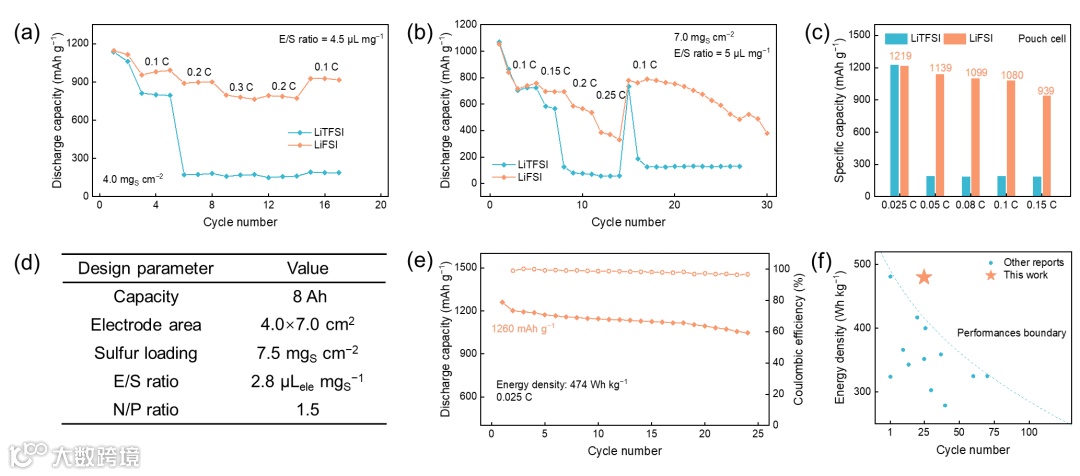 图4. 使用LiFSI电解液的弱溶剂化锂硫电池的性能评估。
