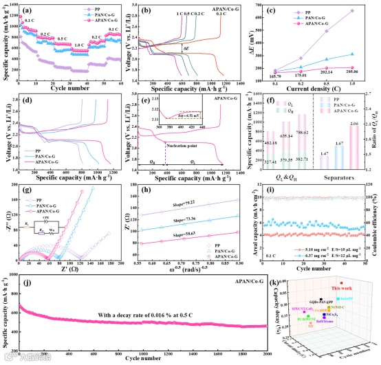 为了评估电化学性能并探究其改进机制,使用APAN/Co-G隔膜组装锂硫电池。APAN/Co-G隔膜表现出优异的倍率性能,硫利用率达到了70%。0.5 C下循环2000次容量衰减率仅0.016%,6.37 mg cm-2高硫负载下实现6.85 mA·h cm-2面容量,低电解液用量(E/S=4 μL mg-1)仍保持77.68%容量保持率。