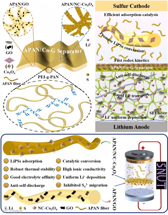 图1. APAN/Co-G隔膜用于锂硫电池的作用机制示意图。