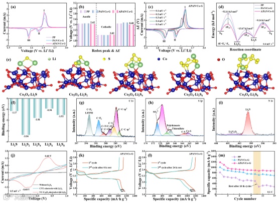 APAN/Co-G隔膜通过协同作用提升锂硫电池性能:(1)NC-Co3O4组分有效吸附多硫化物并催化其转化,大幅提升锂离子扩散系数(8.49×10-8 cm2 s-1)、降低氧化还原反应能垒并改善反应可逆性;(2)APAN/Co-G隔膜强效抑制自放电(静置24小时容量损失仅2%,远优于PP隔膜的37%)并维持稳定开路电压;(3)APAN中的含氮基团促进锂负极形成富含高导锂离子相Li3N/Li2NxOy的稳定SEI层,优化离子传输并均匀化锂沉积,而GO的含氧基团选择性促进Li+传输并静电排斥多硫阴离子。吸附、催化、离子传输调控及负极保护机制的协同作用,共同抑制了多硫化物穿梭、加速了反应动力学、降低了自放电并保护了负极,从而实现了电化学性能的整体增强。