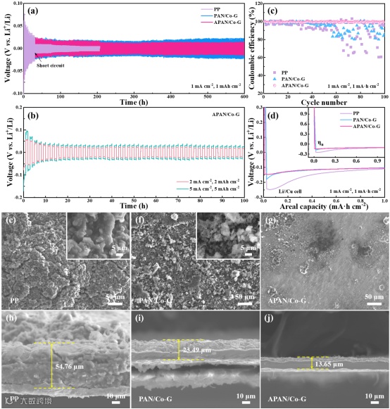 图6. 基于APAN/Co-G隔膜的锂离子电化学行为表征。