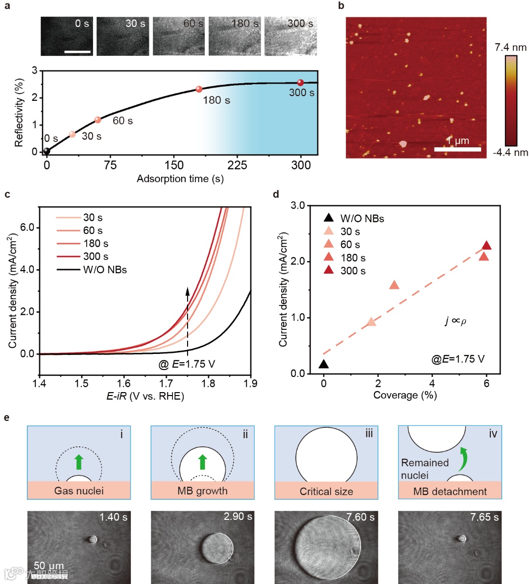 图2. 纳米气泡覆盖度对OER起始电位的影响。(a) 纳米气泡吸附过程中随时间变化的SPRi反射率响应:顶部为表面等离子体共振微分图像(0 s、30 s、60 s、180 s和300 s,比例尺=400 μm),(b) 300 s吸附后电极表面(3×3 μm²)的原子力显微镜图像(含纳米气泡),(c) Pt/Au电极在不同纳米气泡吸附时间(彩色)与无纳米气泡吸附(黑色)条件下的OER极化曲线,(d) 1.75 V(vs RHE)电位下的电流密度与纳米气泡覆盖度的关系图,(e) 表面等离子体共振显微镜(SPRM)原位观测宏观气泡形成/脱离及残留气体核的过程。