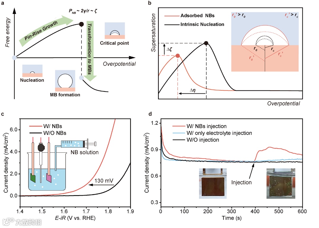 图1. 纳米气泡种子策略促进析气反应发生。(a)电化学初期纳米气泡钉扎生长行为,(b)本征生成(黑色)与吸附(红色)表面纳米气泡附近过饱和度与向MB转变过程中过电势关系的示意图,(c)纳米气泡促进Pt/Au电极的OER性能,(d)在1.7 V(vs RHE)电位下,分别注入纳米气泡溶液(红色)、纯电解液(蓝色)以及未进行任何注入(黑色)后的电流密度变化。