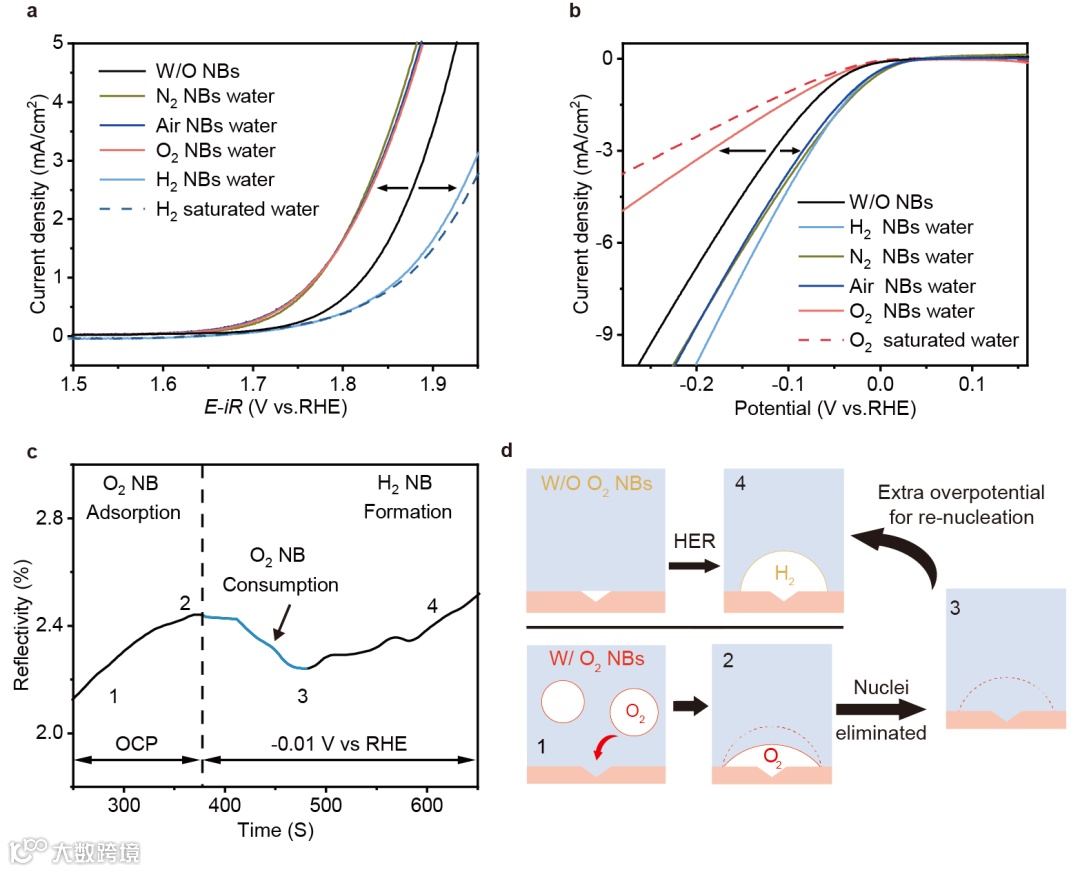 图4. 不同气体种类纳米气泡对析气反应促进作用验证。(a) Pt/Au电极(1×1 cm²)在不同气体环境中的OER极化曲线,(b) Pt/Au电极(1×1 cm²)在不同气体环境中的HER极化曲线,(c) 吸附氧气纳米气泡的Pt/Au电极随时间变化的反射率响应,其中OCP表示开路电位,黑色虚线表示给定电位(-0.01 V vs RHE)的开始时刻,(d) 氧气纳米气泡存在时抑制HER性能的可能机制示意图。