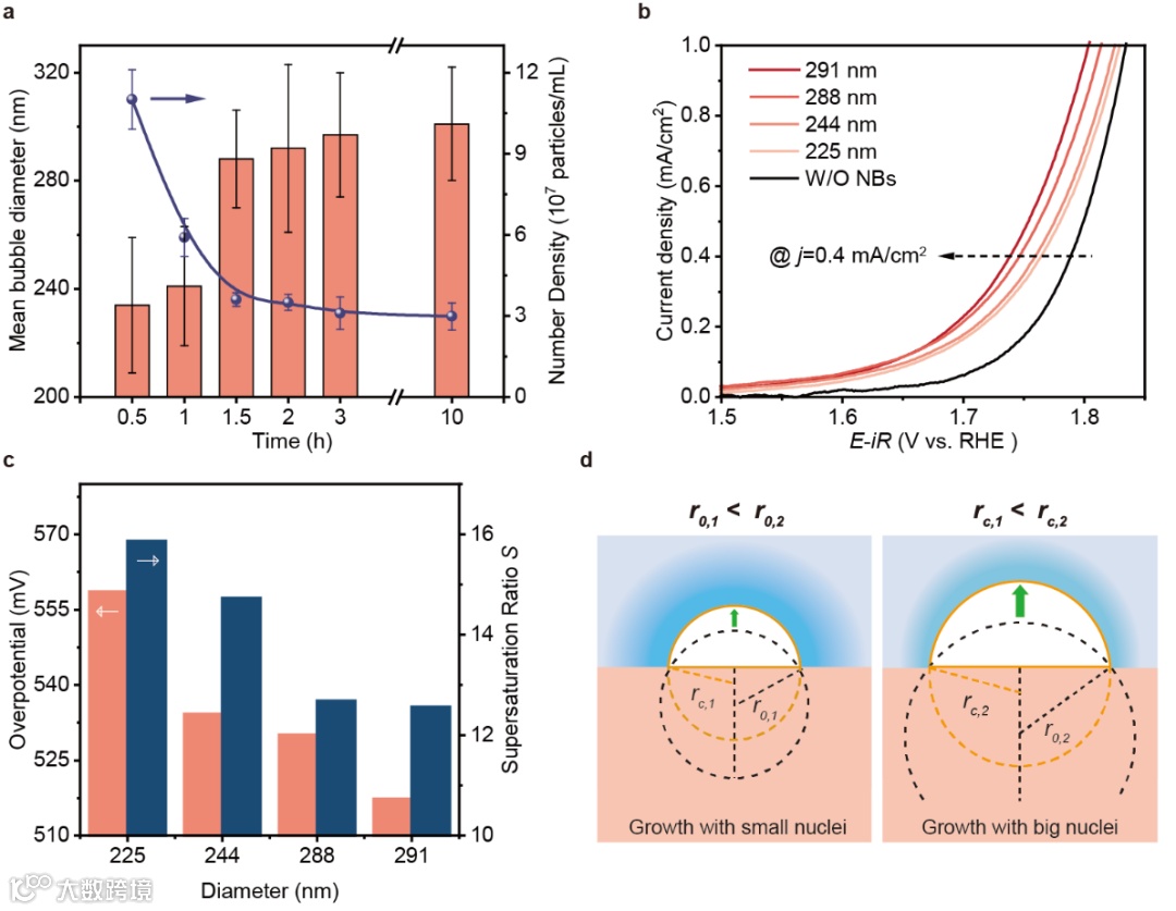 图3. 纳米气泡的尺寸对OER的影响。(a) 10小时内氧气纳米气泡直径和数量密度随时间的变化,(b) Pt/Au电极(1×1 cm²)在不同尺寸纳米气泡吸附(彩色)和无纳米气泡吸附(黑色)条件下的OER极化曲线,(c) 不同尺寸吸附纳米气泡情况下,0.4 mA/cm²电流密度下的OER过电位以及对应的过饱和比S,(d) 小尺寸(左)和大尺寸(右)纳米气泡转变为宏观气泡的差异示意图。