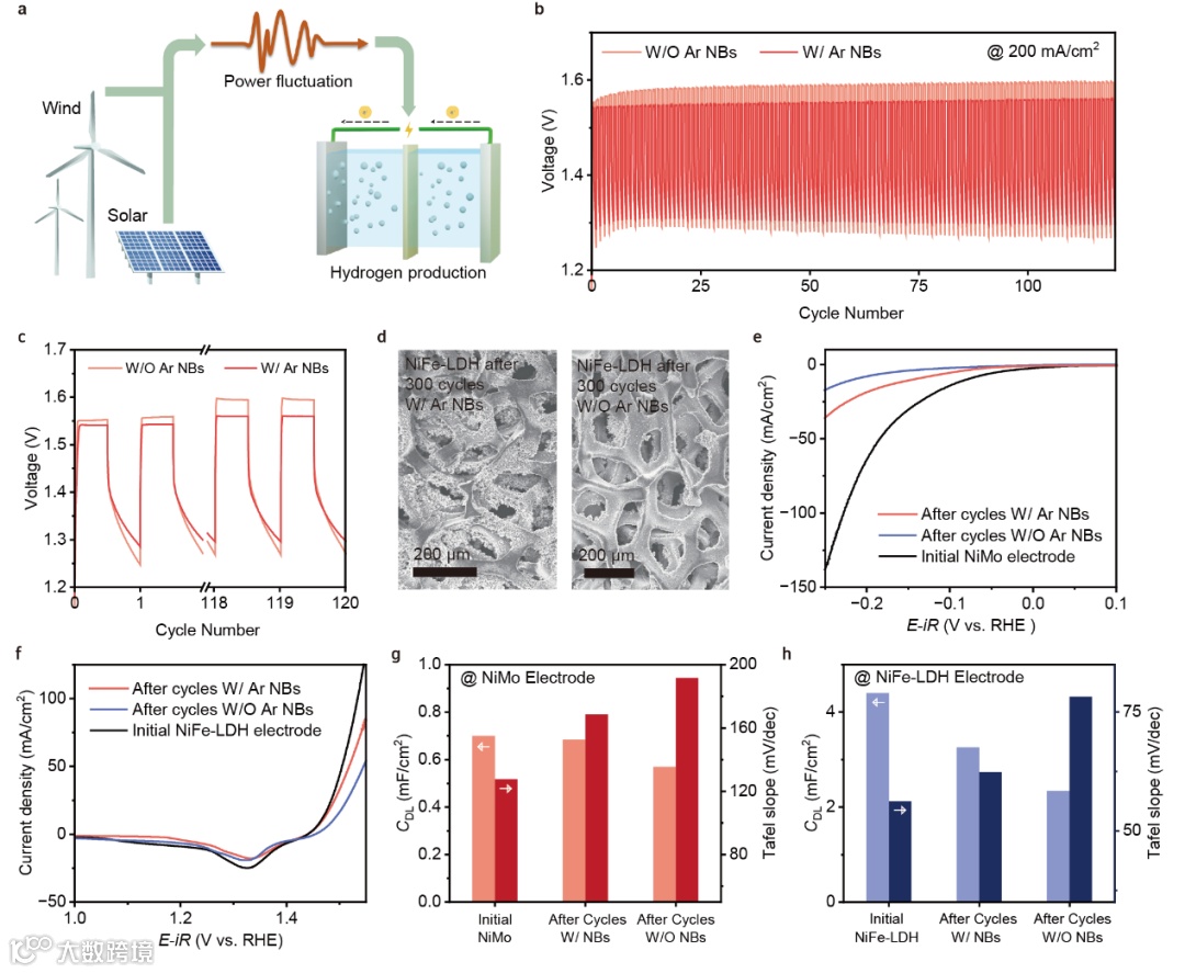 图5. 纳米气泡“种子”策略应用于AEM器件的频繁启停测试。(a) 波动性可再生能源驱动的绿氢生产示意图,(b) 引入/不引入氩气纳米气泡时,阴离子交换膜(AEM)装置在200 mA/cm²电流密度下的间歇启停循环性能,(c) 引入/不引入氩气纳米气泡的间歇启停测试期间电压变化,(d) 经过频繁启停测试后NiFe-LDH电极的SEM图像 (e) NiMo电极在频繁启停测试前后的LSV。 (f) NiFe-LDH电极在频繁启停测试前后的LSV,(g) NiMo电极在频繁启停测试前后的双电层电容(CDL)和塔菲尔斜率,(h) NiFe-LDH电极在频繁启停测试前后的双电层电容(CDL)和塔菲尔斜率。