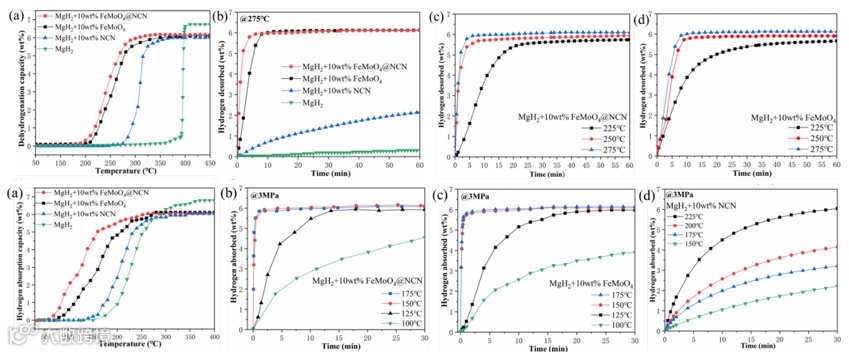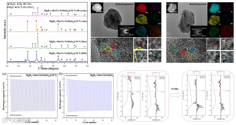 催化机理的研究表明,FeMoO4@NCN在第一次吸放氢过程中在Mg/MgH2颗粒表面原位形成了FeMo合金相,这是整个体系动力学提升的主要原因,NCN较高的比表面积和层状边缘的暴露更有利于FeMo的均匀分布,其三种不同构型的氮加速了吸/脱氢过程中复合体系的电子转移,从而间接促进了FeMo的催化活性。