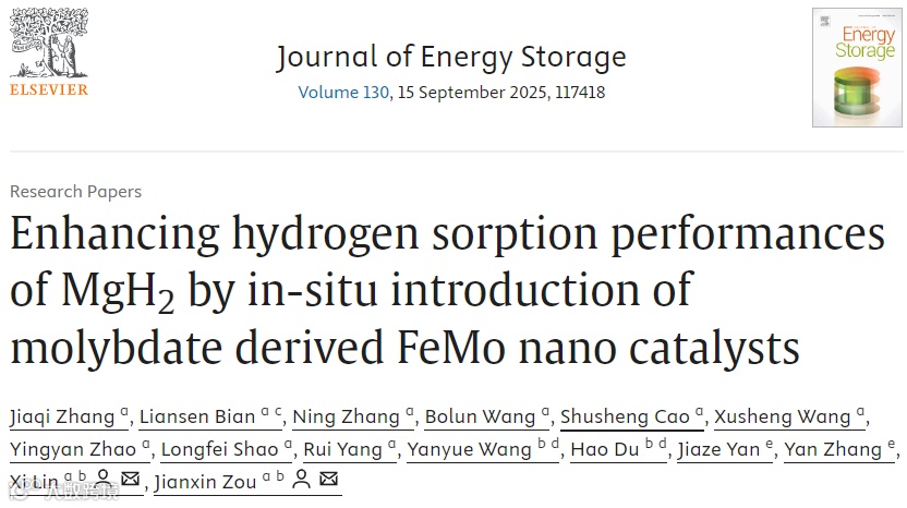 近日,上海交通大学材料科学与工程学院氢科学中心邹建新教授团队在国际学术期刊《Journal of Energy Storage》发表了题为 “Enhancing hydrogen sorption performances of MgH2 by in-situ introduction of molybdate derived FeMo nano catalysts” 的研究论文。该论文介绍了通过原位形成纳米合金催化相的方式来促进镁基氢化物的吸放氢动力学性能和循环稳定性。论文的第一作者为上海交通大学材料科学与工程学院氢科学中心博士后张嘉祺。上海交通大学材料科学与工程学院氢科学中心邹建新教授、林羲助理研究员为论文的通讯作者。