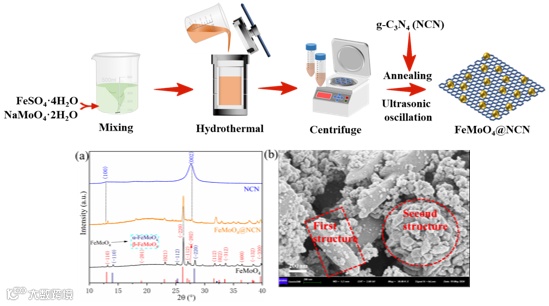 研究团队通过湿化学工艺制备了由g-C3N4负载的FeMoO4纳米双相催化剂。晶粒的平均尺寸基本在200 nm以下,呈现出二维纳米棒及颗粒双相形貌。高比表面积的石墨相氮化碳为之后Mg/MgH2的负载提供了丰富的形核生长位点。