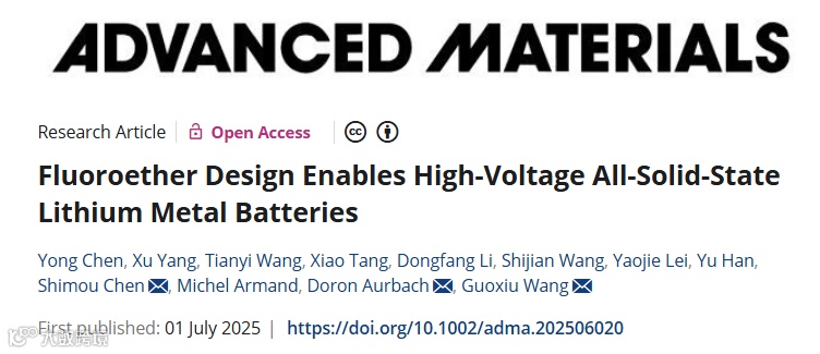 近日,澳大利亚悉尼科技大学汪国秀院士联手巴伊兰大学Doron Aurbach、北京化工大学陈仕谋教授等人,在国际知名期刊Advanced Materials上发表题为”Fluoroether Design Enables High-Voltage All-Solid-State Lithium Metal Batteries”的研究性论文。该工作首创性地将氟醚链段“植入”氧化物纳米复合相表面,并复合PEO基聚合物构筑出全新固态电解质(FTOC-SSE)。得益于氟醚柔性缓冲与纳米填料双重效应,该全固态电解质不仅展现卓越的高压抗氧化耐久性,而且实现了离子传输与界面稳定性的同步提升:Li//Li对称电池循环超9500h无短路,NCM811//Li全电池在4.5V高压下亦保持长寿命、高容量。