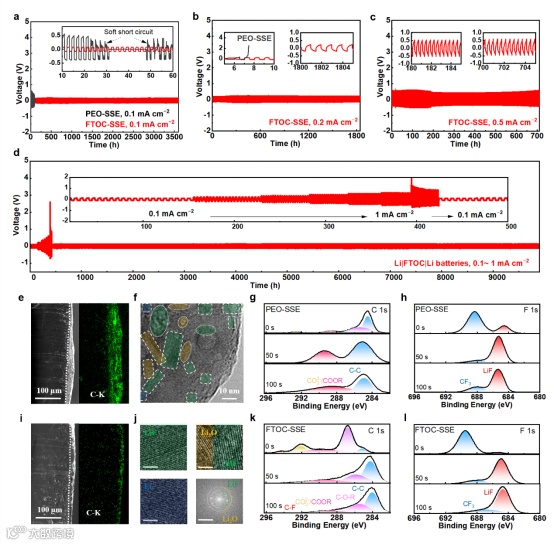 在多种测试条件下(不同温度、不同电流密度),FTOC-SSE均表现出与锂金属负极卓越的兼容性。对锂金属负极表面沉积形貌分析表明,FTOC的引入使锂在负极表面呈致密沉积;冷冻电镜进一步揭示该致密层由丰富的无机纳米晶体构成。深度XPS结果则证实,FTOC全固态电解质有助于在锂金属表面构筑富含无机LiF的超薄SEI,有效抑制PEO基聚合物电解质的过渡分解。