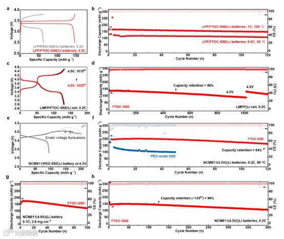 在全电池测试中,作者先以LFP体系验证FTOC-SSE在30–100 °C范围内的宽温可操作性;随后通过LMFP电池证明其高压稳定性(4.5V);最终在NCM811全电池中展示了卓越的抗氧化性能。