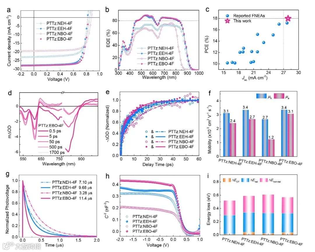 图4. OSCs的光伏性能和物理特性。(a)J-V曲线。(b)EQE光谱。(c)文献中基于完全非稠环电子受体OSCs器件的PCE和Jsc统计图。(d)PTTz:EBO-4F共混膜在800 nm激发下的TA光谱。(e)TA动力学曲线。(f)空穴和电子迁移率。(g)TPV特性。(h)电容-电压特性。(i)OSCs的能量损失。