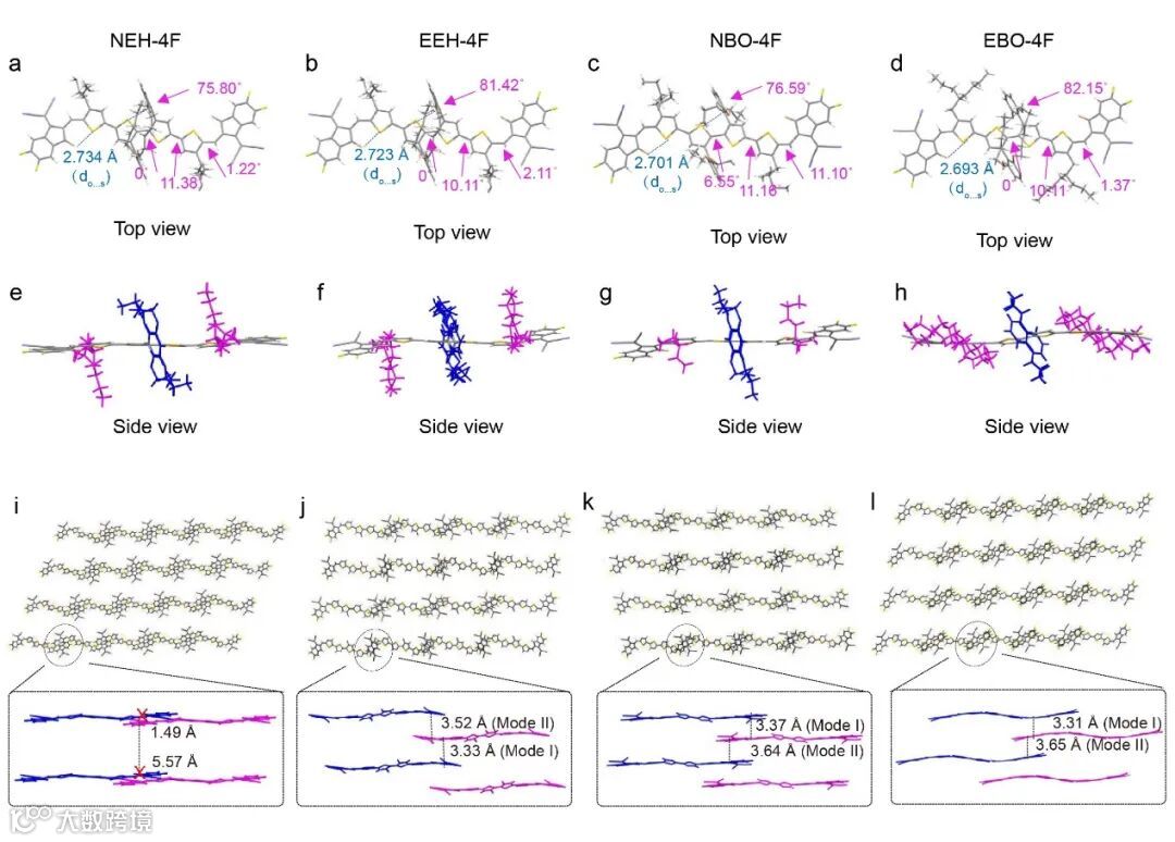 图2. FNEAs的单晶结构表征。(a-d)四种FNEAs的单晶结构俯视图。(e-h)四种FNEAs的单晶结构侧视图。(i-l)晶体网络结构和分子间堆积模式。