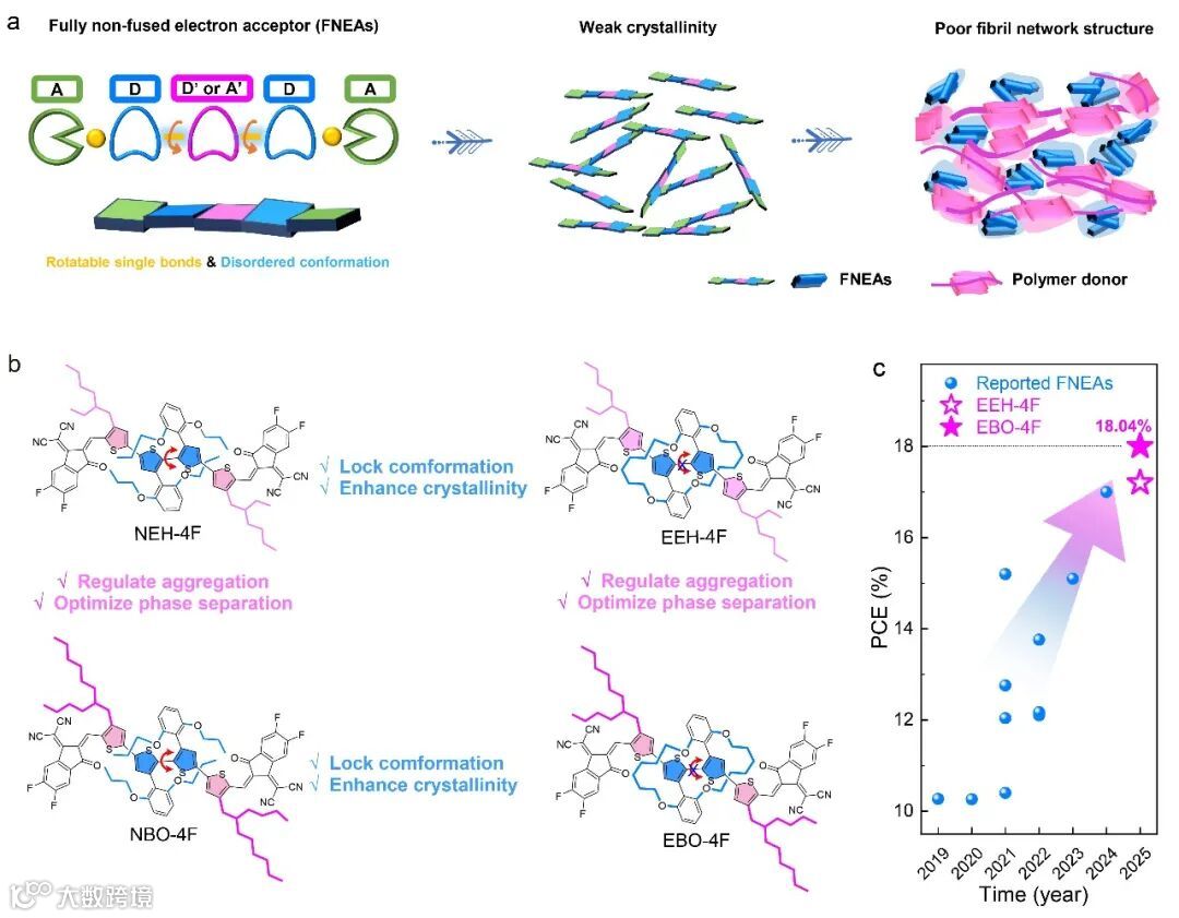 有机太阳电池(OSCs)因其轻质、柔性及可溶液加工等优势成为了一种极具前景的光伏技术,并且近年来其能量转换效率(PCE)已突破20%。然而,目前主流稠环电子受体复杂的合成路线及低产率的环化反应严重制约了其成本竞争力与商业化进程。为解决这一短板,构筑单元间完全由碳-碳(C-C)单键相连的完全非稠环电子受体(FNEAs)被报道,其可显著降低材料成本。但值得注意的是,FNEAs也存在一些发展瓶颈:C-C单键的自由旋转导致分子构象不稳定,削弱了π-π相互作用,进而引发受体结晶弱、π电子离域受限及电荷传输受阻等核心问题;同时,其与聚合物给体之间过度的混溶性阻碍了合适尺度相分离结构的形成,难以构建纳米纤维状双连续互穿网络形貌,致使短路电流密度(Jsc)和填充因子(FF)显著降低。这使得FNEAs基有机太阳电池的PCE远落后于稠环有机太阳电池。因此,精确调控FNEAs的分子构象与结晶性,协同优化分子堆积行为及相分离形貌,对于突破其效率瓶颈、实现高性能低成本有机光伏器件至关重要。
