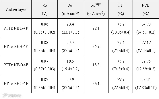 表1. 基于NEH-4F、EEH-4F、NBO-4F和EBO-4F的OSCs的器件性能参数。