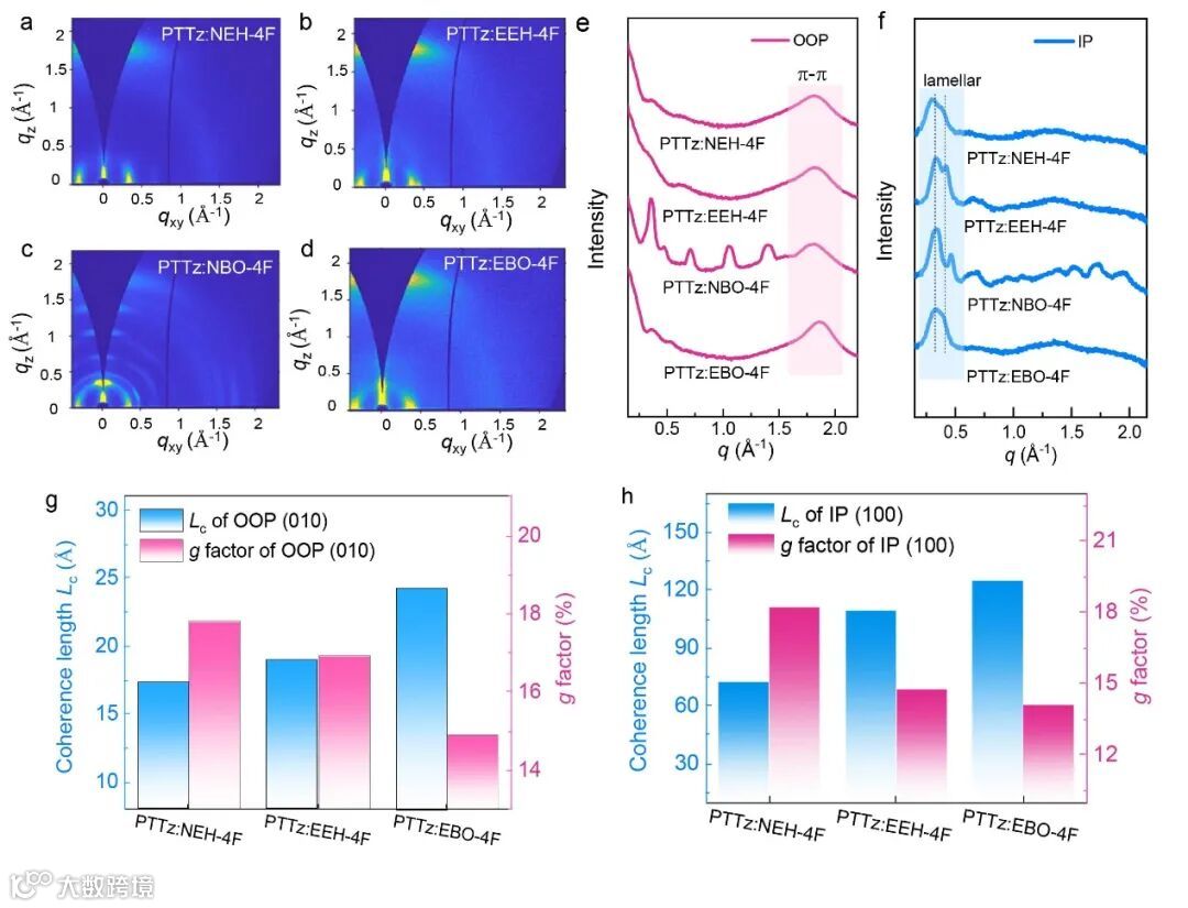 图5. 共混物膜的GIWAXS表征。(a-d)二维GIWAXS图。(e-f)PTTz:FNEA共混膜在OOP方向和IP方向上的一维GIWAXs曲线。(g,h)g因子及Lc。