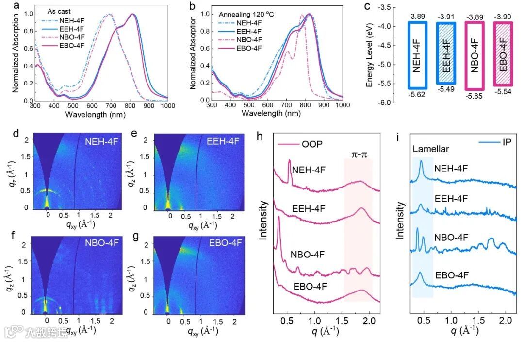 图3. FNEAs的光学、电化学和结晶性质。(a,b)FNEAs的铸态薄膜及120 ℃退火后的吸收光谱,(c)能级图,(d-g)二维GIWAXS图,(h-i)对应的一维GIWAXS曲线。