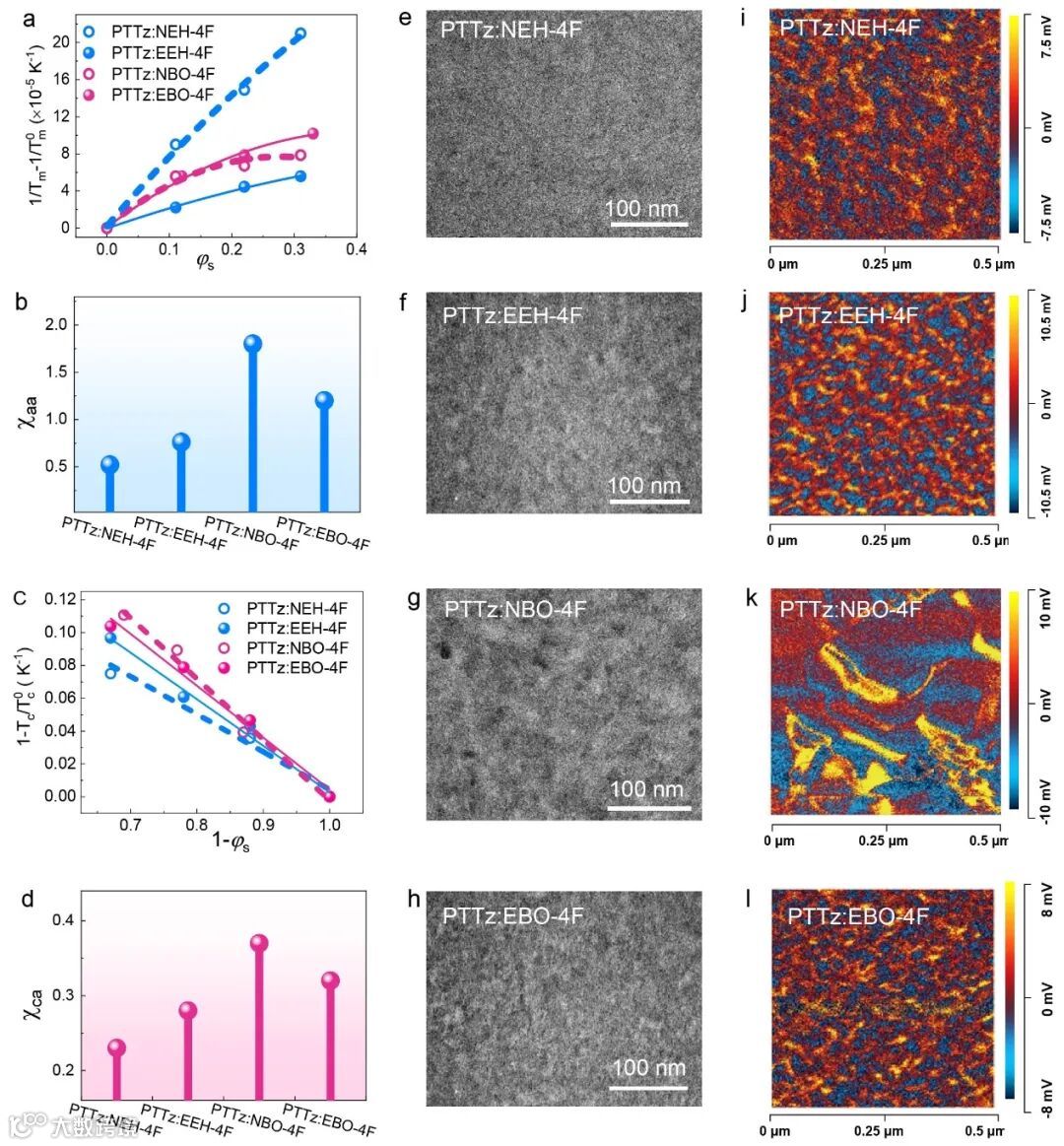 图6. 相容性和形貌表征。(a−b)基于Tm随受体体积分数变化的测量对χaa进行估算,以及共混物χaa比较。(c−d)基于Tc随受体体积分数变化的测量对χca进行估算,以及共混物的χca比较。(e−h)TEM图。(i−l)AFM-IR图。