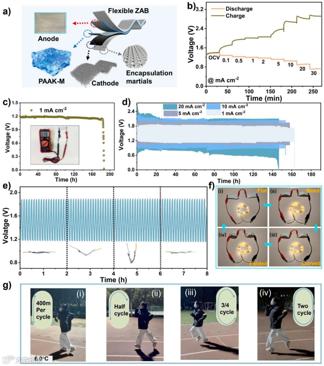 图6. 柔性可充锌空气电池性能。