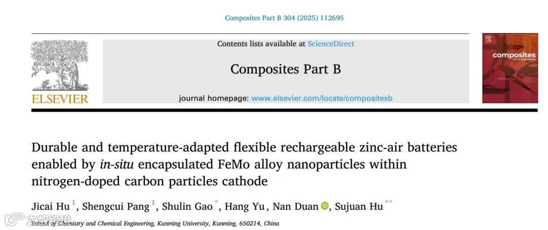 近日,昆明学院胡素娟课题组在国际期刊Composites Part B上发表的题为“Durable and temperature-adapted flexible rechargeable zinc-air batteries enabled by in-situ encapsulated FeMo alloy nanoparticles within nitrogen-doped carbon particles cathode”的研究论文。该研究通过设计嵌入氮掺杂多孔碳颗粒中的FeMo合金纳米颗粒(FeMo/NCPs)作为催化剂,系统揭示了双金属合金协同效应在调控电子结构与活性位点中的关键作用。同步辐射结果验证了Fe和Mo在氮掺杂碳基体中的原子分散,借助密度泛函理论(DFT)计算,理论计算证实了引入Mo优化了催化剂的电子结构,降低了ORR关键步骤中OH*脱附的自由能垒,提升了O2吸附与中间体转化行为,在碱性介质中,催化剂的半波电位(E1/2)为0.85V,在10 mA cm-2下的电位(E10)为1.62V。在-25至60 °C宽温区间内,基于FeMo/NCPs的水性RZABs的循环寿命超过2720 h,峰值功率密度为139 mW cm-2,研究为宽温柔性FRZABs的电极材料开发与稳定性设计提供了新策略与理论指导。