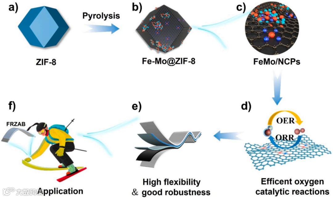 图1. 通过自生长策略合成FeMo/NCPs复合催化剂的结构示意及其在柔性锌空气电池中的应用场景。