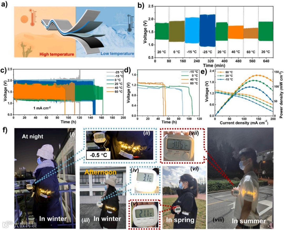为了拓展FRZABs在室外复杂环境下的应用,开发具备极端温度适应能力的FRZABs显得尤为重要。基于FeMo/NCPs阴极的FRZABs在低温环境下依然展现出优异性能,其中在−15 ℃与0 ℃下的放电持续时间分别达到89 h和106 h;在−15 ℃、20 ℃和60 ℃下,其功率密度分别可达98、121和141 mW cm-2。同时,在春、夏、冬等不同季节条件下,所构建的LED照明系统均可保持稳定运行,进一步验证了其在多变环境中的良好稳定性与实用性。
