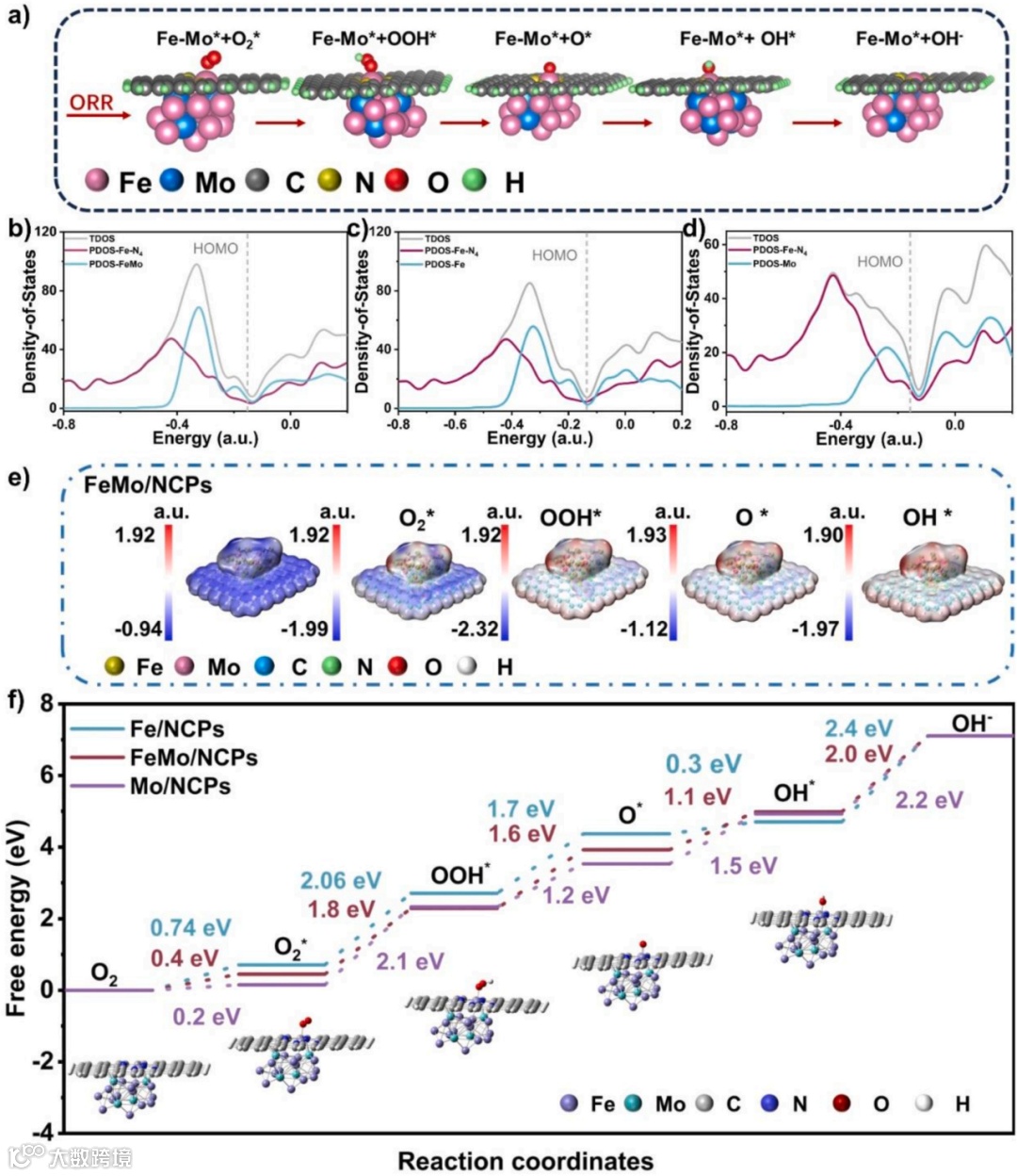 图4. 理论计算证实了引入Mo优化了催化剂的电子结构,降低了ORR关键步骤中OH*吸附和解吸的自由能垒。