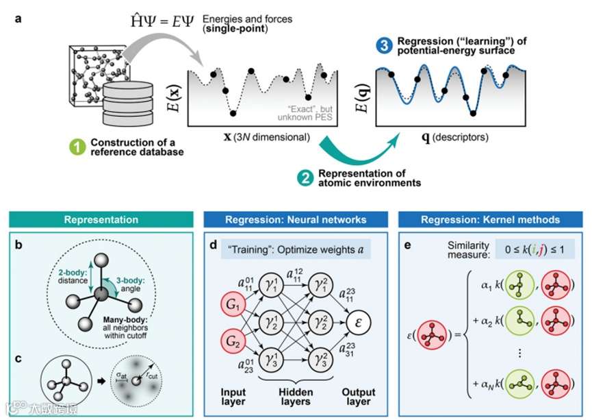 e) 机器学习的分子动力学的特点,分类和工作流程