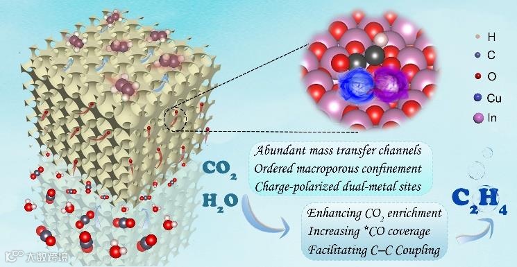 在H2O和太阳能的辅助下,将CO₂光催化转化为C₂H₄代表着一种具有重大意义的可持续发展策略。然而,这一方法仍然面临重大挑战。C1中间体(例如*CO)在催化剂上的弱吸附导致其过早解吸,且C-C偶联步骤能垒较高,阻碍了多碳产物的有效形成。为了解决这些局限性,我们需要合理设计光催化剂,增强对关键中间体的吸附,使反应途径向C-C偶联方向选择性进行,从而提高CO₂向C₂H₄转化的速率和产物选择性。基于此,设计具有三维有序大孔(3DOM)结构的光催化剂,利用其大孔限域效应促进CO₂分子的富集和转化以及对C1中间体的捕获。同时,构建异核双金属活性位点,利用电荷极化减轻相邻中间体的静电斥力,降低C-C偶联能垒,促进C2+产物的生成。