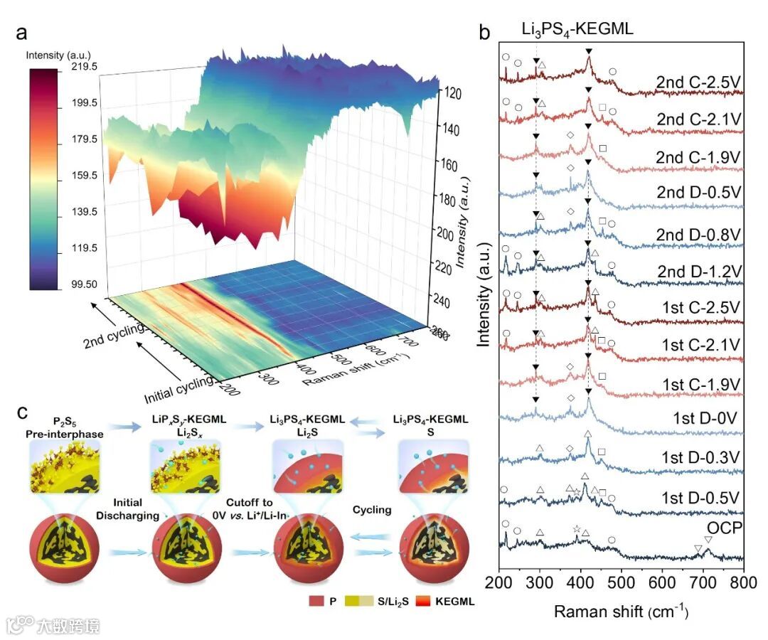 图 4. 原位拉曼光谱揭示电化学循环机制。a) 三维等高线图和 b) 相应的光谱分析(▼来自 Li3PS4 的峰,☆来自 P-S-P 的峰,▽来自 P=S 的峰,△来自 P-S 的峰,〇来自 S-S 的峰,◇来自 Li2S 的峰,□来自 Li2SX 的峰)。c) 耦合反应机制示意图。