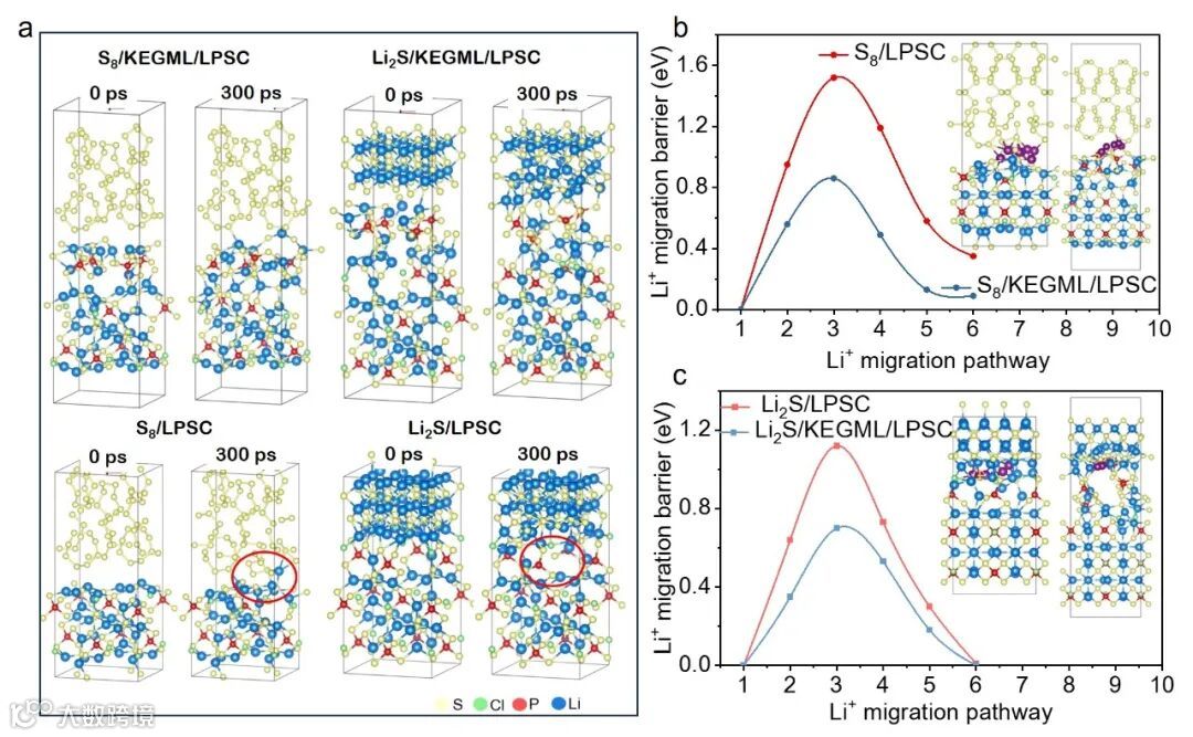 图 6. a) 经过 AIMD 模拟(300 皮秒)后所选的 S8/KEGML/LPSC、Li2S/KEGML/LPSC、S8/LPSC 和 Li2S/LPSC 模型的结构变化。b) 在 b) S8/KEGML/LPSC、S8/LPSC,c) Li2S/KEGML/LPSC 和 Li2S/LPSC 界面处 Li+ 迁移路径的能量分布。