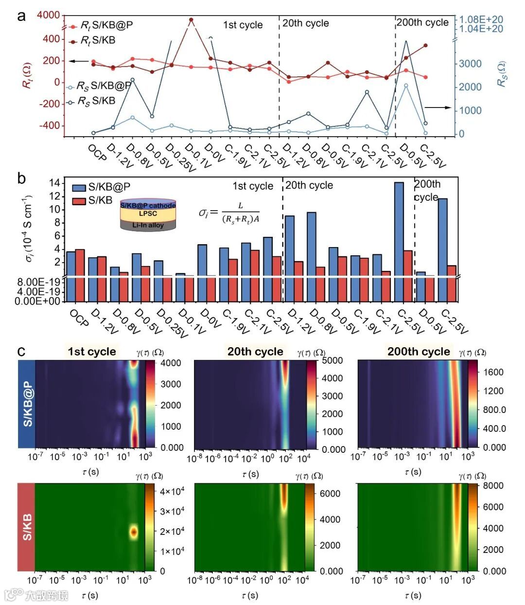 图 5. a) 等效电路的阻抗参数值。b) 计算得到的离子电导率(阴极和 LPSC 层)。c) S/KB@P 阴极和 S/KB 阴极在第 1 次、第 20 次和第 200 次循环时的 DRT 分析。