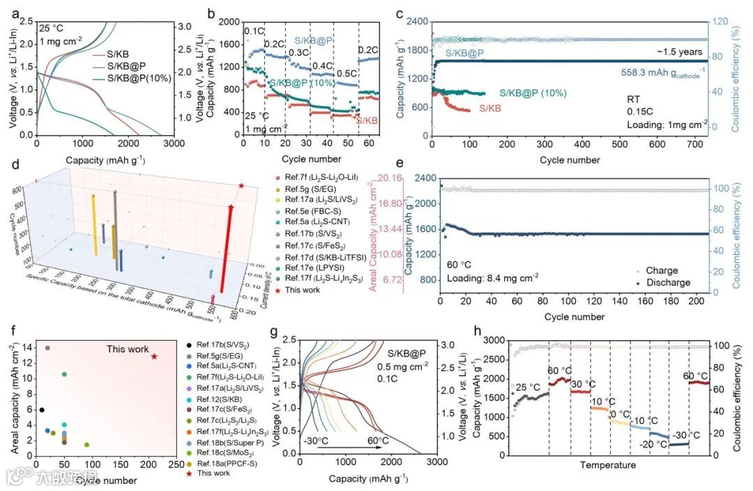 图 3. a) 0.1C 下 S/KB、S/KB@P 和 S/KB@P(10%) 正极的初始充放电电压曲线,b) 倍率性能,c) 循环性能。d) 循环性能及容量对比。e) 活性负载为 8.4 毫克/平方厘米时 0.1C 下的循环性能。f) 循环性能及面容量对比。g-h) 不同温度下基于 Li3PS4-KEGML 的 ASSLSBs 在 0.1C 下的电化学性能。