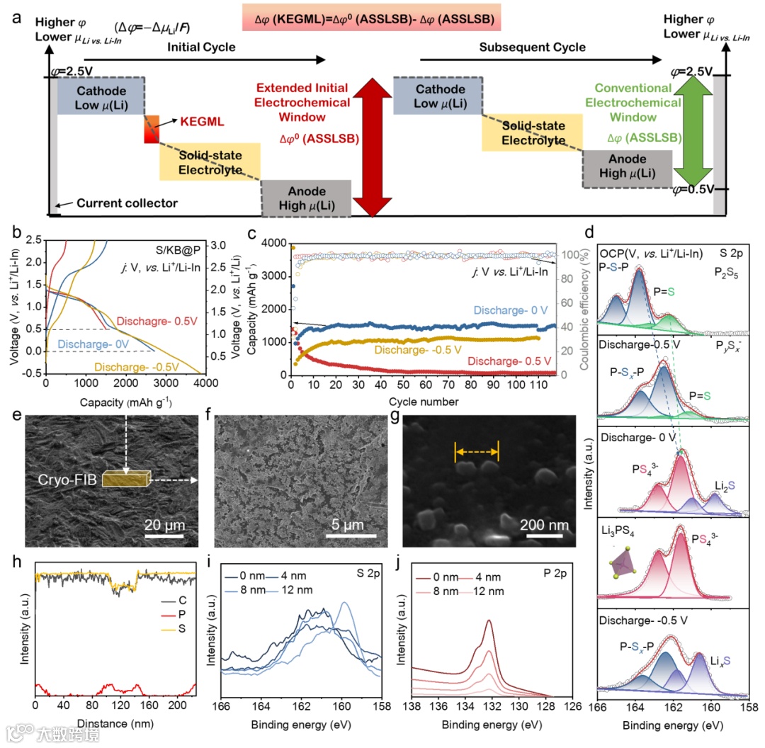 图 2. a) 基于 KEGML 的 ASSLSB 运行所应用的电化学窗口(颜色条)示意图。变量 μ 和 φ 分别表示化学势和电势。符号 F 表示电场力,用于解释电荷与电位差之间的关系。b) S/KB@P 正极在 0.1C 下活性负载为 1mg cm−2 时不同放电截止电位下的充放电曲线,以及 c) 循环性能。d) S/KB@P-LiI 正极在相应放电截止电位下的 S 2p XPS 谱图。e-g) 冷冻聚焦离子束扫描电子显微镜(Cryo-FIB-SEM)图像。h) 2g 中可视化线的 P、S 和 C 的扫描电子显微镜(SEM)-能谱(EDX)线扫描。i) S/KB@P-LiI 正极放电至 0 V 对 Li+/Li-In 时的 S 2p 和 j) P 2p 深度剖面 XPS 谱图。