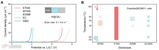 图4. 电解液的氧化稳定性和工作温度。(A) 在扫速为0.1 mV−1的Li||Al@C(涂炭铝箔)半电池中的线形扫描伏安测试。(B) 采用不同电解液的石墨||NCM811全电池的工作温度区间。
